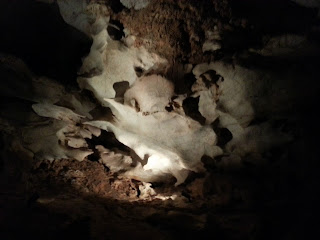 This area was so incredible. It's one of two area's that is called the Crystal rooms. The reason it's called that is because the walls are covered with calcite crystals. At one time this area was filled with water that had a very high calcium carbonate content. The area got sealed off when a sink whole collapsed inward. The water was trapped in the area and couldn't escape. The crystals started to precipitate out from the brine with one atom attaching to the next atom allowing a crystal to grow with a reflection of that internal arrangement of atoms. With time the water went away leaving these incredible crystals. I was like Oh Gosh I'm in a huge GEODE. I couldn't believe I was actually walking around in an area that was just like how a geode is formed. This was so different from the travertine that was on the other walls. Travertine forms when there is calcium carbonate in solution as it drips from the Limestone around it. The water evaporates off and the calcium carbonate stays building up in a layered fashion and not reflecting the internal structure of the atoms involved.